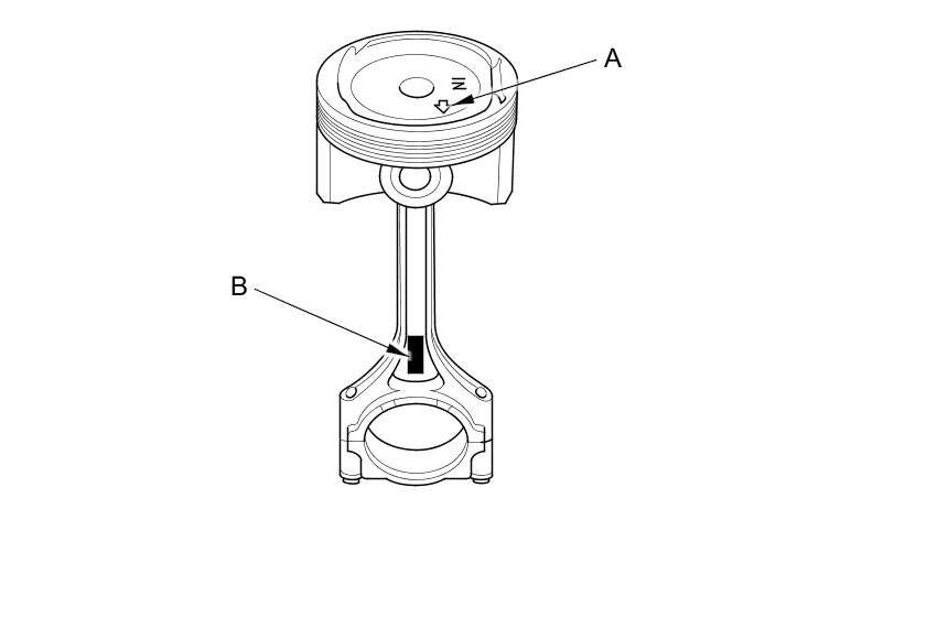 1. Assemble the piston and the connecting rod with the arrow (A) and the embossed mark (B) on the same side.