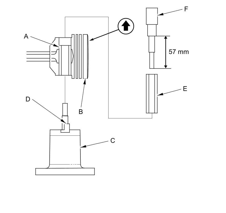 4. Press the pin (E) in with the insert pin and the insert adjust (F) and a hydraulic press.