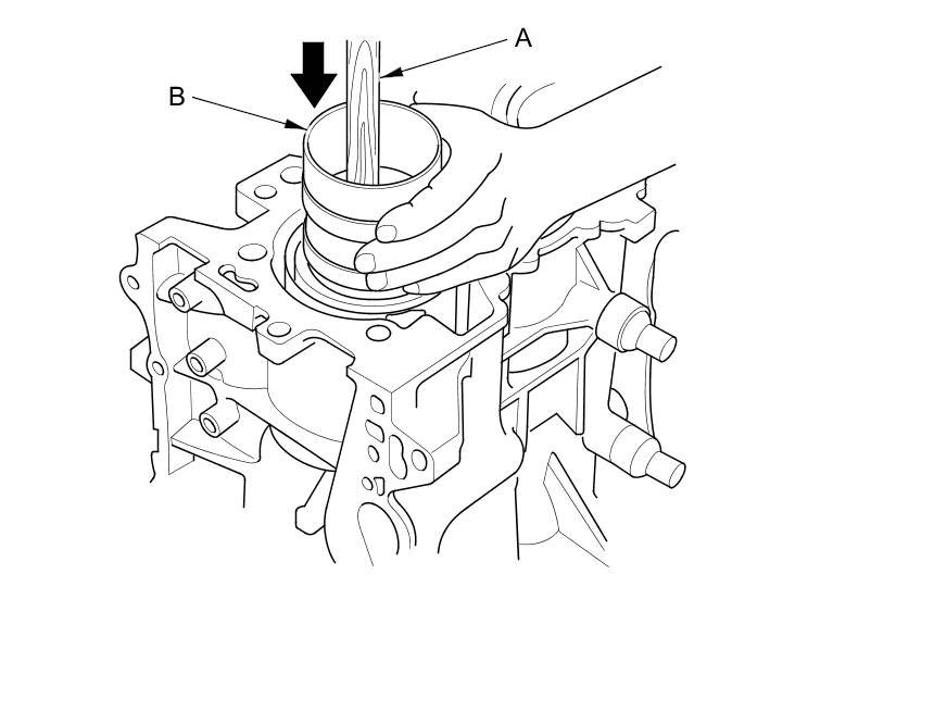 4. Position the piston/connecting rod assembly in the cylinder, and tap it in using the wooden handle of a hammer (A). Maintain downward force on the ring compressor (B) to prevent the rings from expanding before entering the cylinder bore.