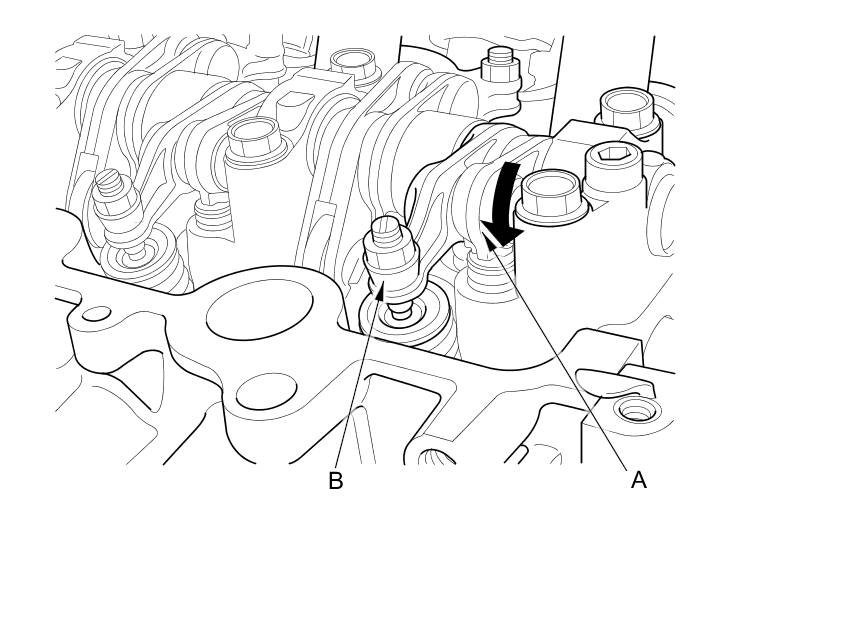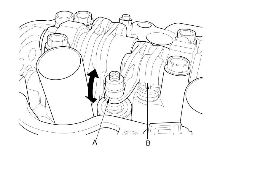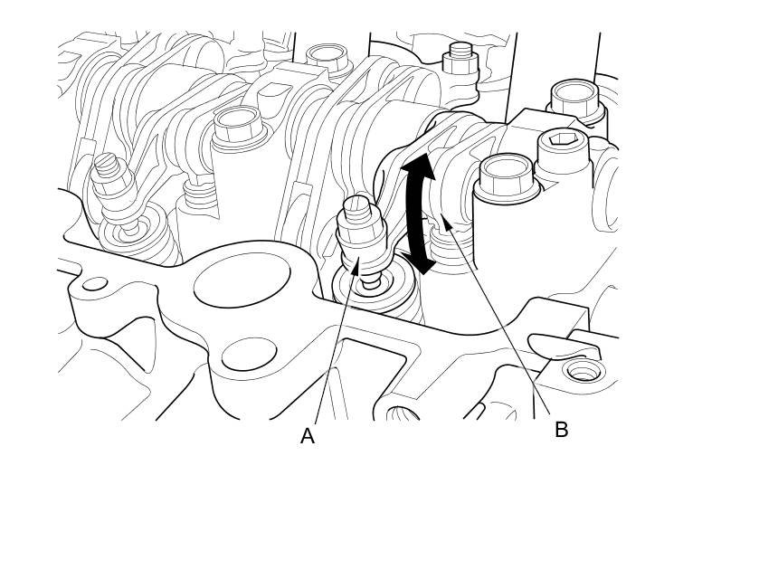 4. Push on the intake primary rocker arm (A) for the No. 1 cylinder. Make sure that the intake primary rocker arm and the intake secondary rocker arm (B) are mechanically connected by the rocker arm pistons and that the intake secondary rocker arm does not move when pushed manually:
