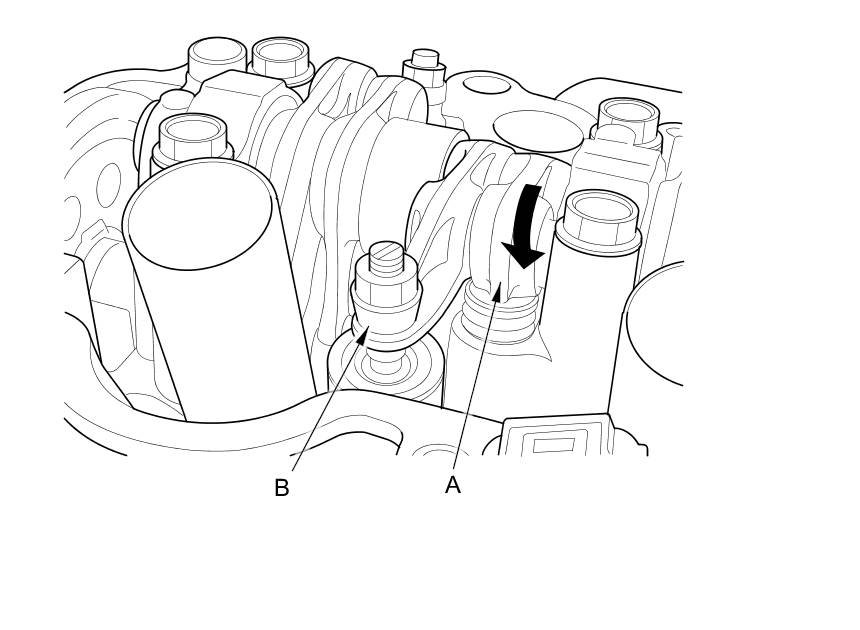 10. Move the intake secondary rocker arm (A) for the No. 1 cylinder. The intake secondary rocker arm should move independently of the intake primary rocker arm (B):