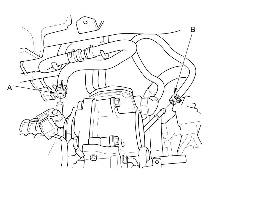 4. Disconnect the brake booster vacuum hose (A) and the EVAP canister hose (B).