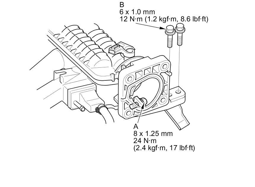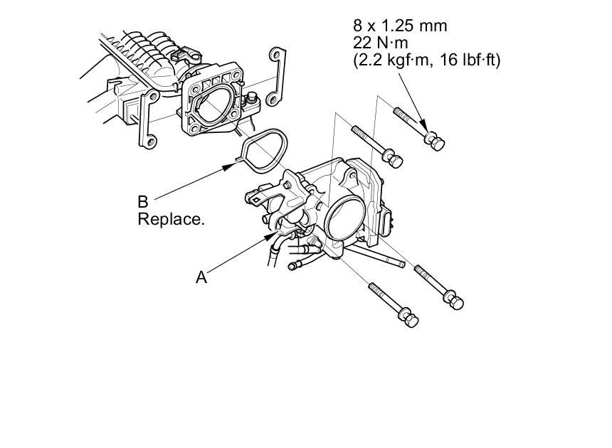 5. Install the throttle body (A) with a new gasket (B).