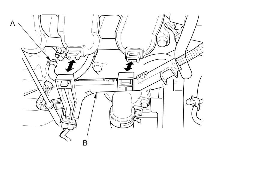 4. Loosen the intake manifold bracket mounting bolt (A). Tighten the mounting bolts (B), then tighten the mounting bolt (A).