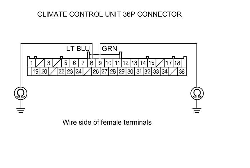 8. Check for continuity between body ground and climate control unit 36P connector terminals No. 8 and No. 9 individually.