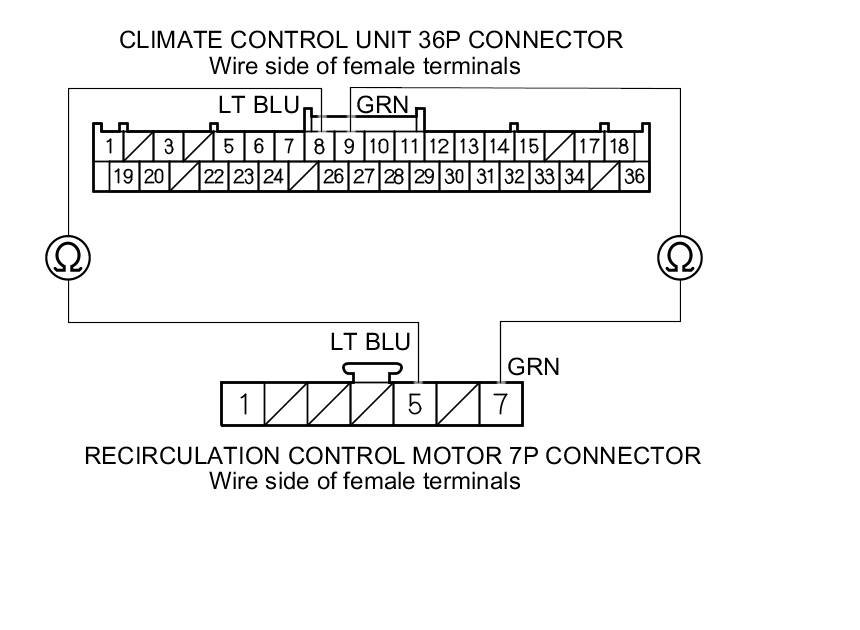 12. Check for continuity between the following terminals of the climate control unit 36P connector and the recirculation control motor 7P connector.