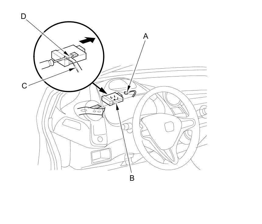 NOTE: While separating the TPMS control unit from the bracket, use a flat-tipped screwdriver (D) to push and release it from the bracket.
