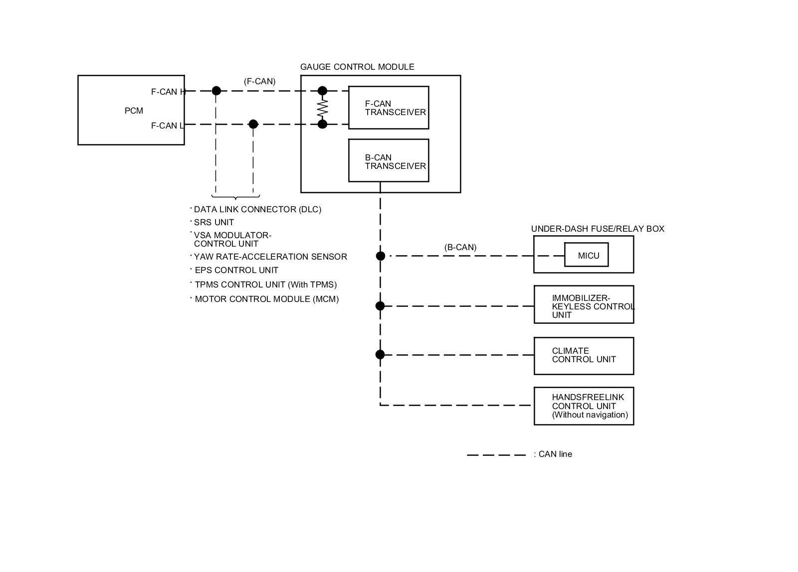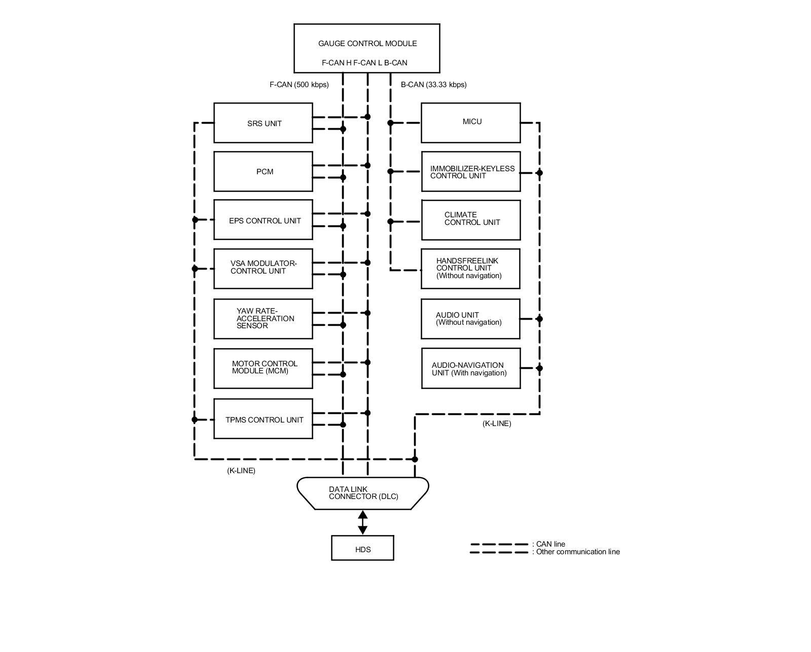 By connecting the HDS to the data link connector (DLC), the HDS can retrieve the diagnostic information from the MICU via a diagnostic line called the K-LINE. The K-LINE is a separate communication line from the CAN lines, but it is connected to most of the CAN related ECUs. The MICU is a gateway between the HDS and B-CAN related ECUs, and sends B-CAN diagnostic information to the HDS. When doing a function test with the HDS, the HDS sends an output signal through the K-LINE to the MICU. The MICU either relays the request to another ECU, or commands the function itself.