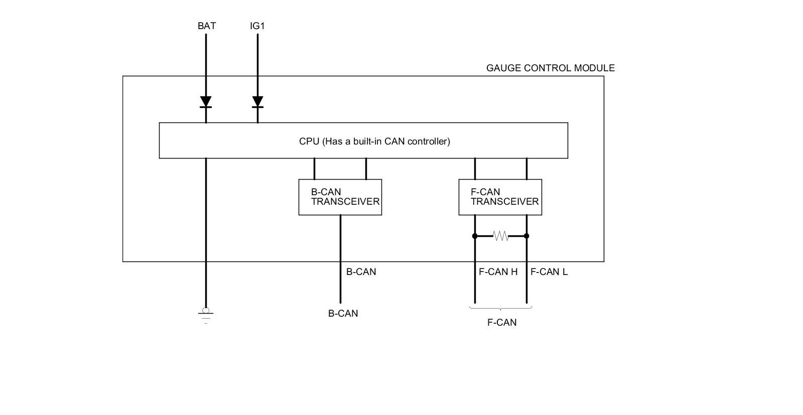 The body controller area network (B-CAN) and the fast controller area network (F-CAN) share information between multiple electronic control units (ECUs). B-CAN communication moves at a slower speed (33.33 kbps) for convenience related items and for other functions. F-CAN information moves at a faster speed (500 kbps) for "real time" functions such as fuel and emissions data. To allow both systems to share information, the gauge control module translates and relays the information from B-CAN to F-CAN and from F-CAN to B-CAN. This is called the Gateway Function.