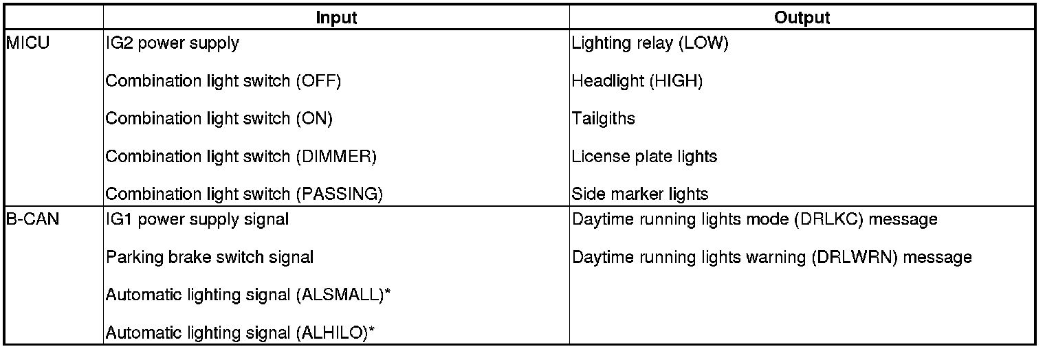 The MICU controls the headlights as daytime running lights based on inputs from each switch.