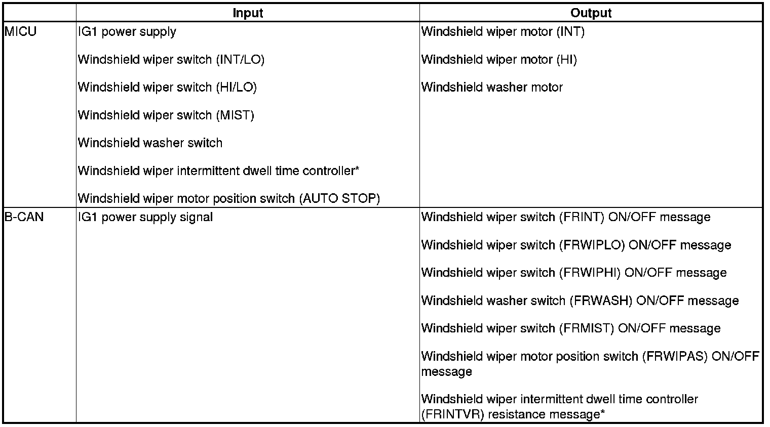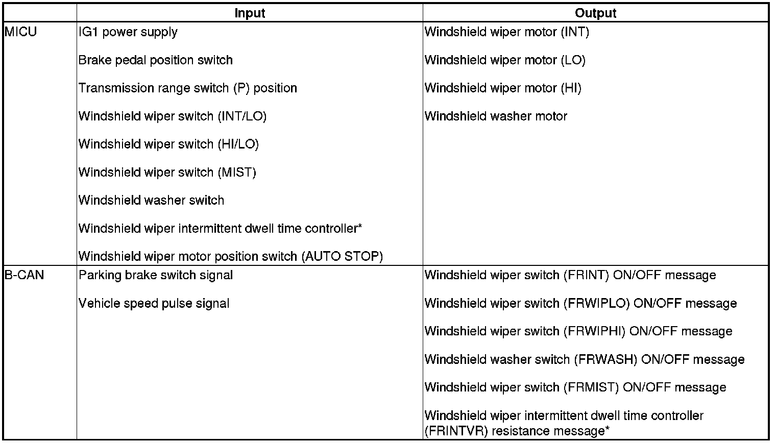 The MICU controls the windshield wiper motor and the windshield washer motor based on inputs from each switch.