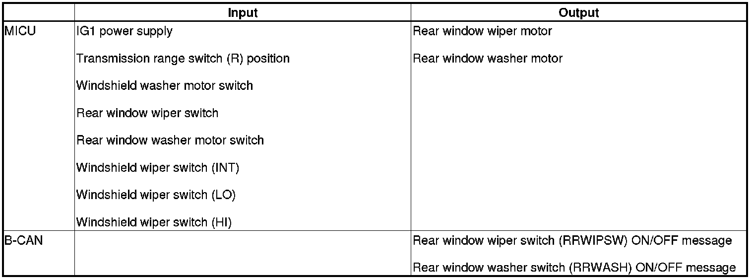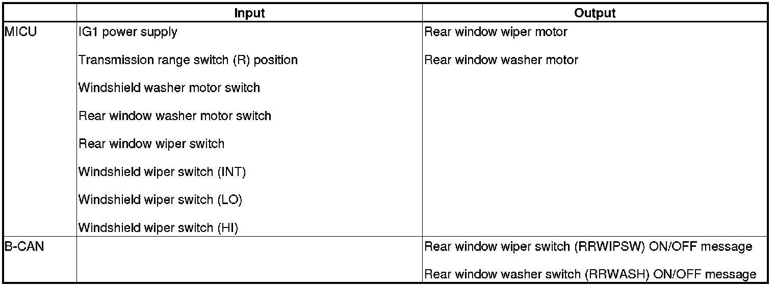 The MICU controls the rear window wiper motor and the rear washer motor based on inputs from each switch.