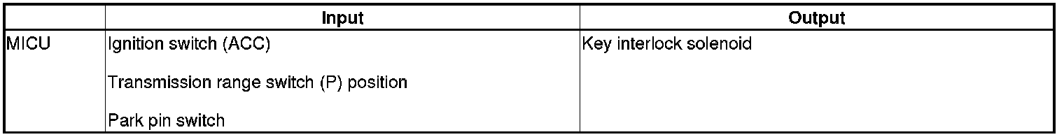 The MICU controls the key interlock solenoid based on ignition switch ACCESSORY (l) position, the transmission range switch P position, and the park pin switch inputs.