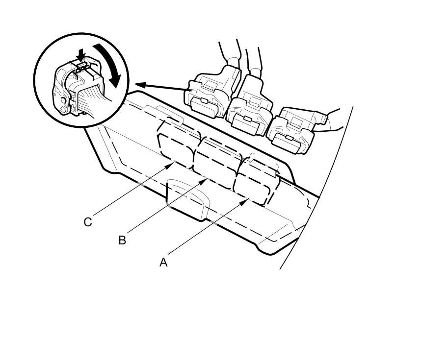 NOTE: PCM connectors A, B, and C have symbols (A=(square), B=(triangle), C=(circle)) embossed on them for identification.