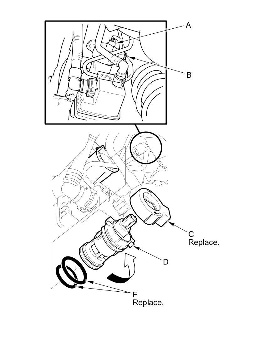 7. Install the parts in the reverse order of removal with new O-rings (E) and a new cap.