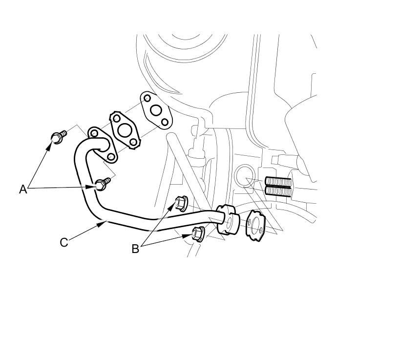 2. Install the EGR pipe to the TWC side, tighten the bolts (C) by hand with a new gasket (D), then torque the bolts.
