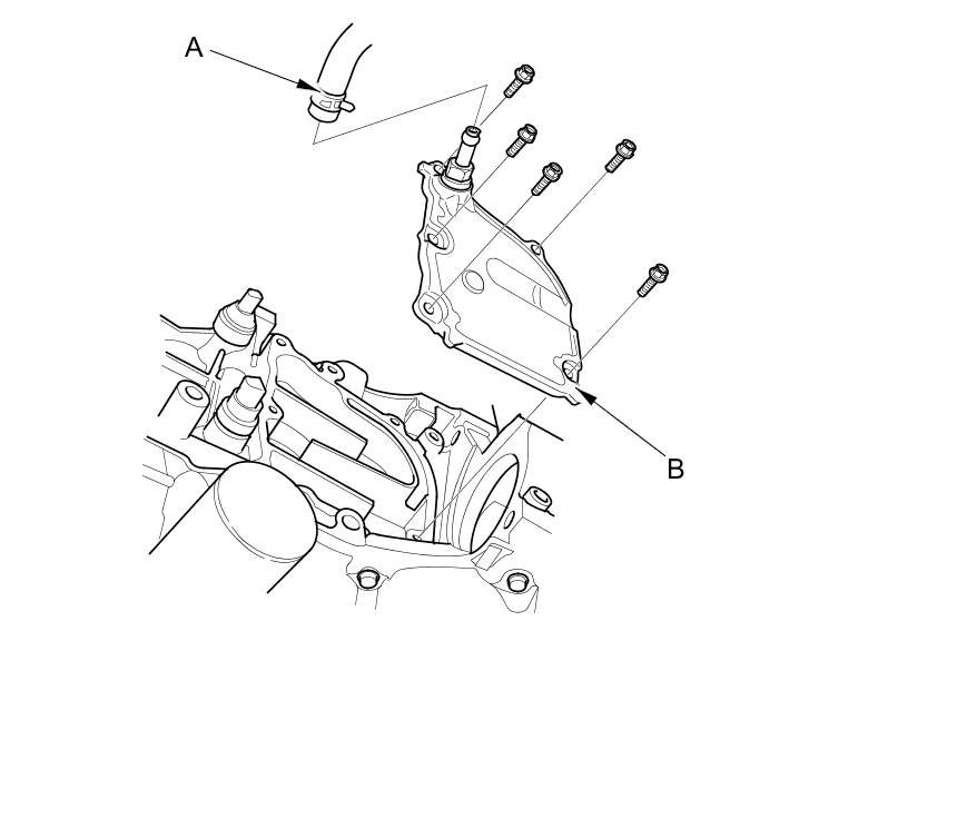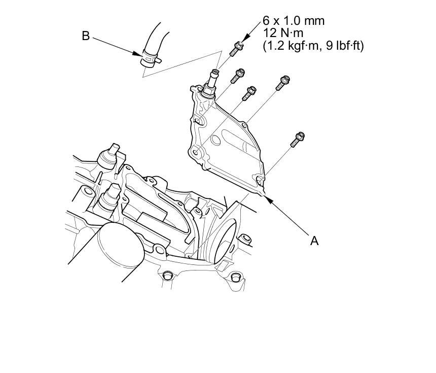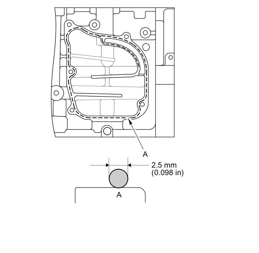- Apply a 2.5 mm (0.098 in) diameter bead of liquid gasket along the broken line (A).