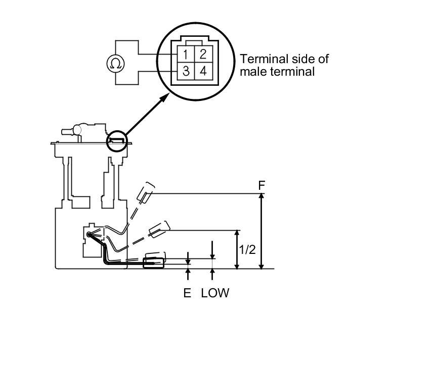10. Measure the resistance between fuel tank unit 4P connector terminals No. 1 and No. 3 with the float at E (EMPTY), LOW (LOW FUEL INDICATOR), 1/2 (HALF FULL), and F (FULL) positions.
