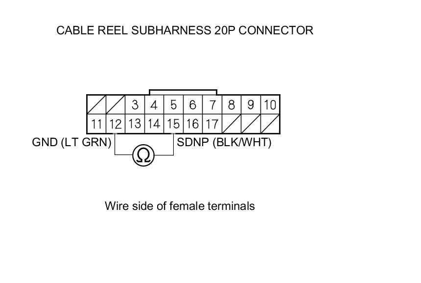 2. Check for continuity between cable reel subharness 20P connector terminals No. 12 and No. 15 when pressing and releasing the paddle shifter - (downshift switch).