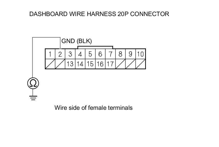 6. Check for continuity between dashboard wire harness 20P connector terminal No. 2 and body ground.
