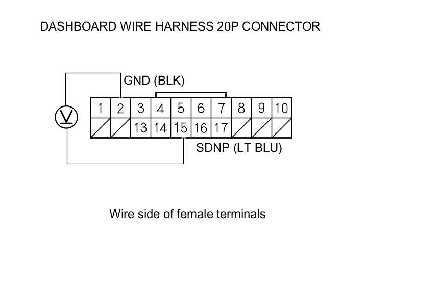 9. Measure the voltage between dashboard wire harness 20P connector terminals No. 2 and No. 15.