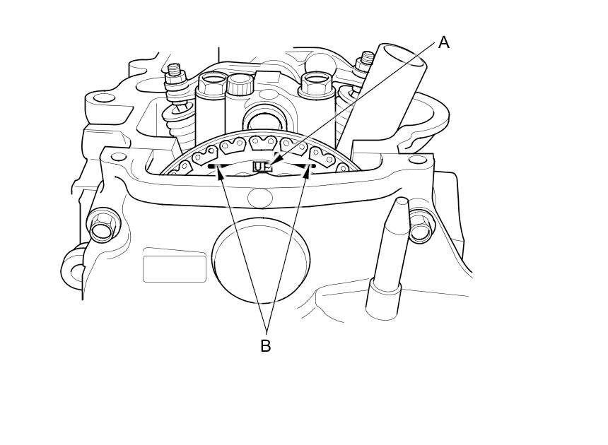 2. Set the No. 1 piston at top dead center (TDC). The "UP" mark (A) on the camshaft sprocket should be at the top, and the TDC grooves (B) on the camshaft sprocket should line up with the top edge of the head.