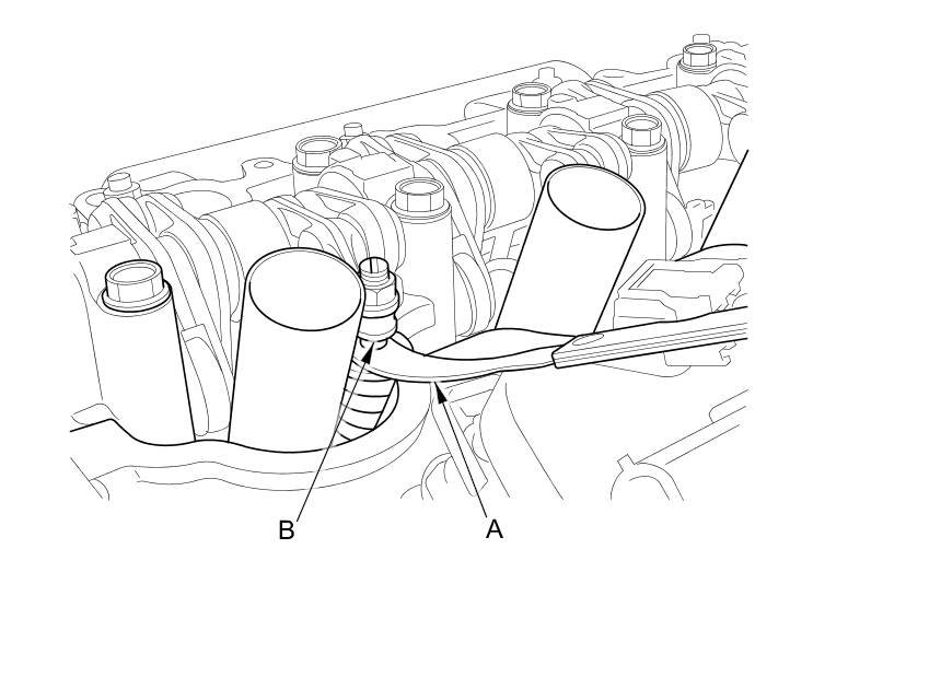 4. Insert the feeler gauge (A) between the adjusting screw (B) and the end of the valve stem on No. 1 cylinder, and slide it back and forth; you should feel a slight amount of drag.