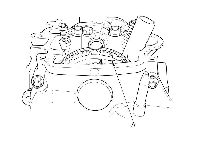7. Rotate the crankshaft clockwise. Align the No. 3 piston TDC groove (A) on the camshaft sprocket with the top edge of the head.