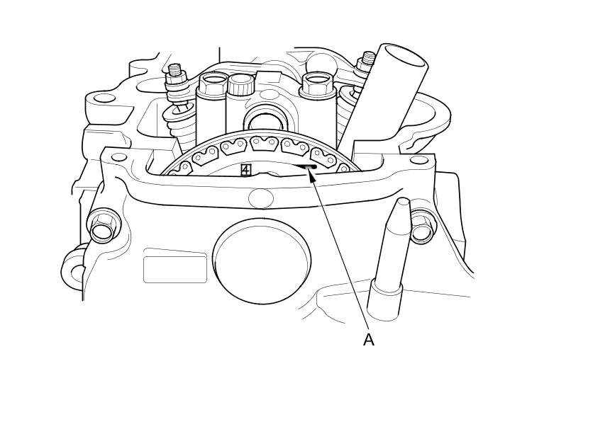 9. Rotate the crankshaft clockwise. Align the No. 4 piston TDC groove (A) on the camshaft sprocket with the top edge of the head.