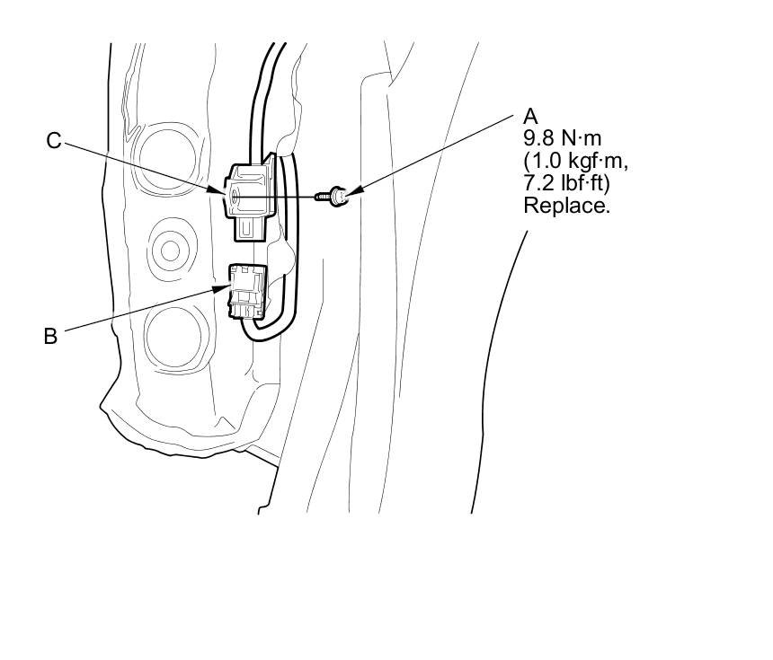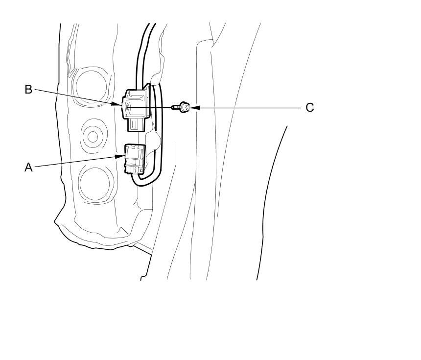 1. Install the front impact sensor with a new TORX bolt (A), using a TORX T30 bit. Connect the engine compartment wire harness 2P connector (B) to the front impact sensor (C).
