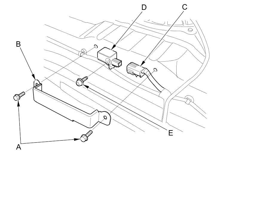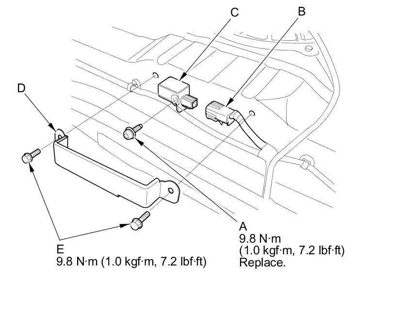 2. Install the rear safing sensor cover (D) with two bolts (E).