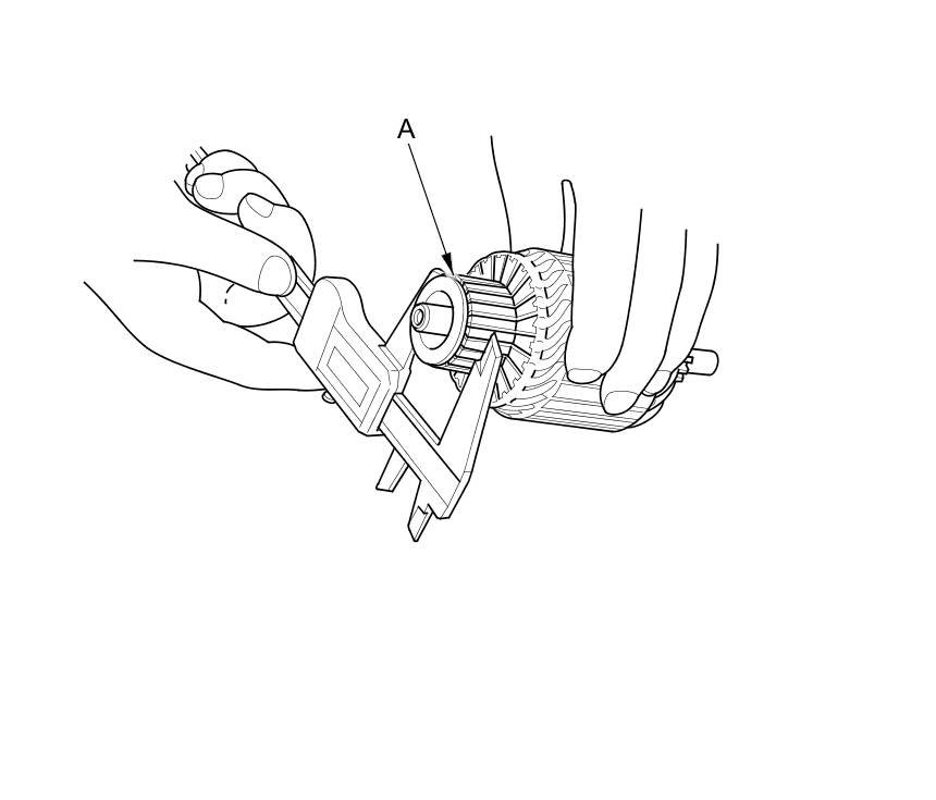 6. Use a digital caliper or dial type caliper to check the mica depth (A). If the mica depth is below the service limit, replace the armature.