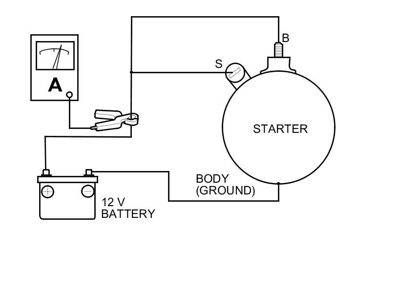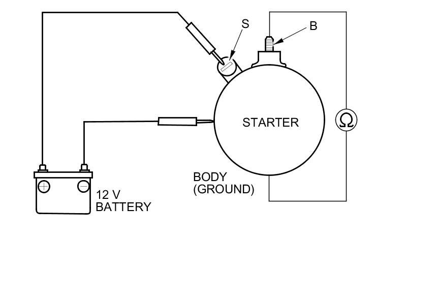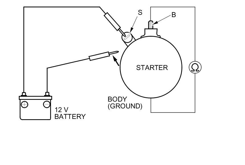 4. Connect the battery as shown, and check for continuity between the B terminal and the starter body. If there is continuity, it is working properly.