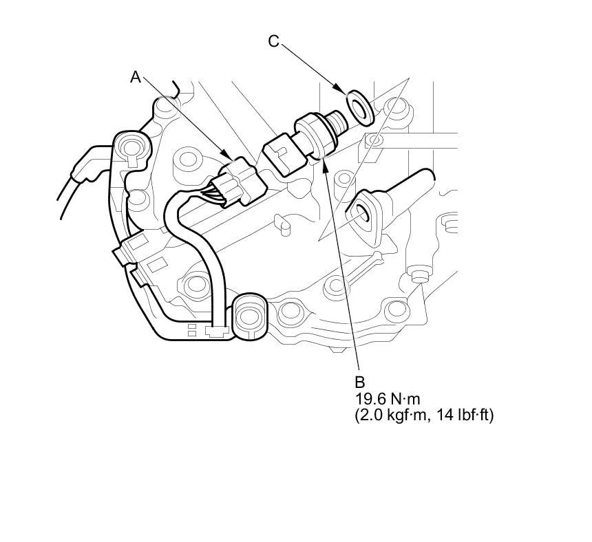 4. Disconnect the CVT driven pulley pressure sensor 3P connector (A), then remove the CVT driven pulley pressure sensor (B) and sealing washer (C).