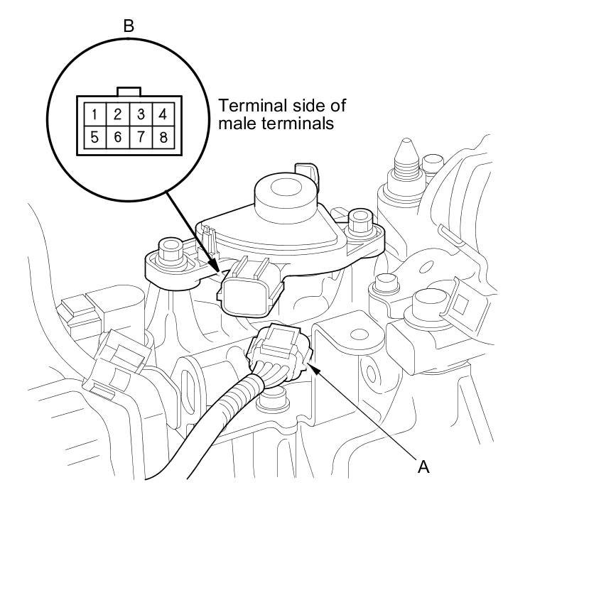 3. Check for continuity between terminals at the transmission range switch 8P connector (B). There should be continuity between the terminals in each switch position as shown in the following table.