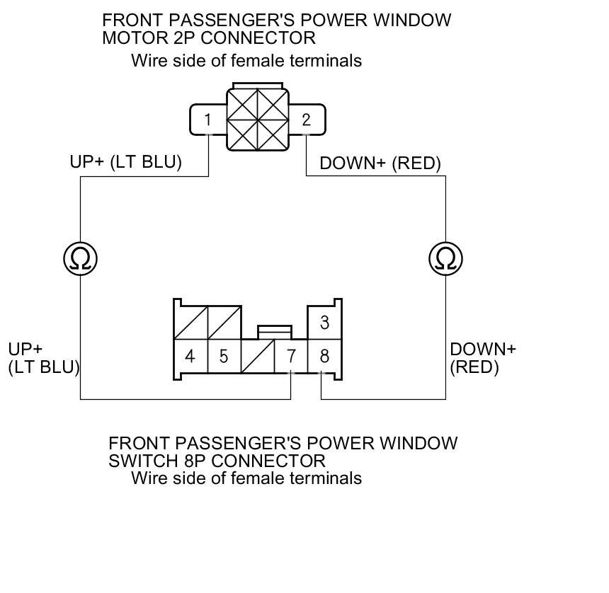 2. Test the motor in each direction by connecting battery power and ground to the front passenger's power window switch 8P connector according to the table.