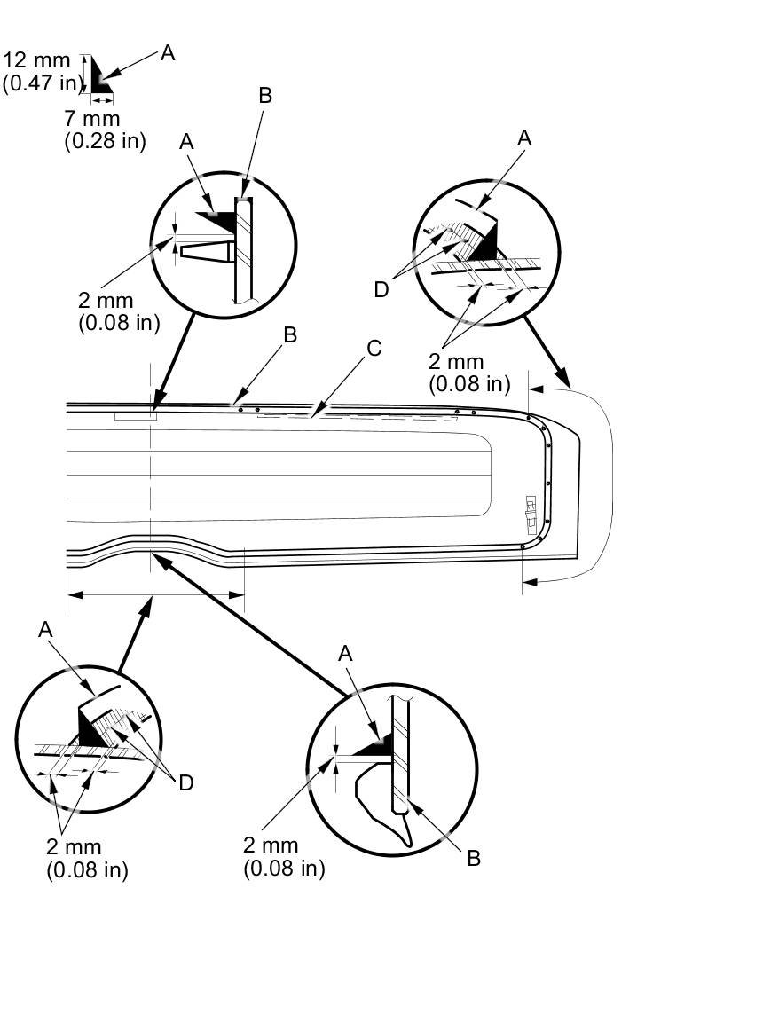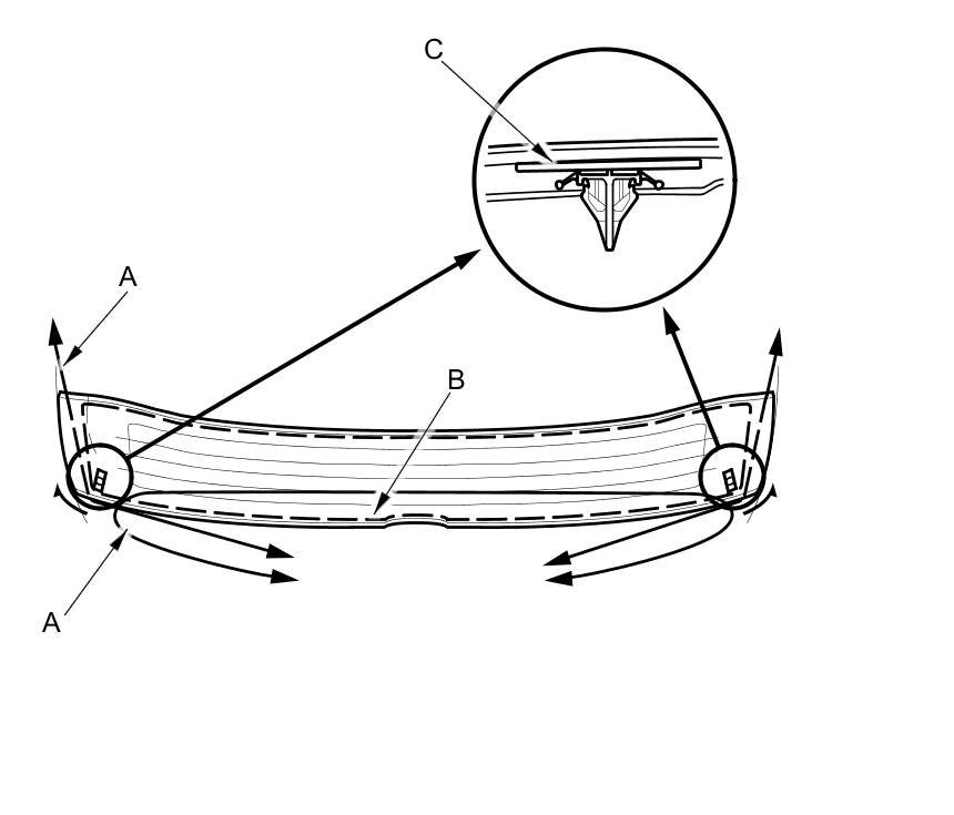 20. Pack adhesive into the cartridge without air pockets to ensure continuous delivery. Put the cartridge in a caulking gun, and run a continuous bead of adhesive (A) to the lower rear window (B) along the edge of the rubber dams (C) as shown: