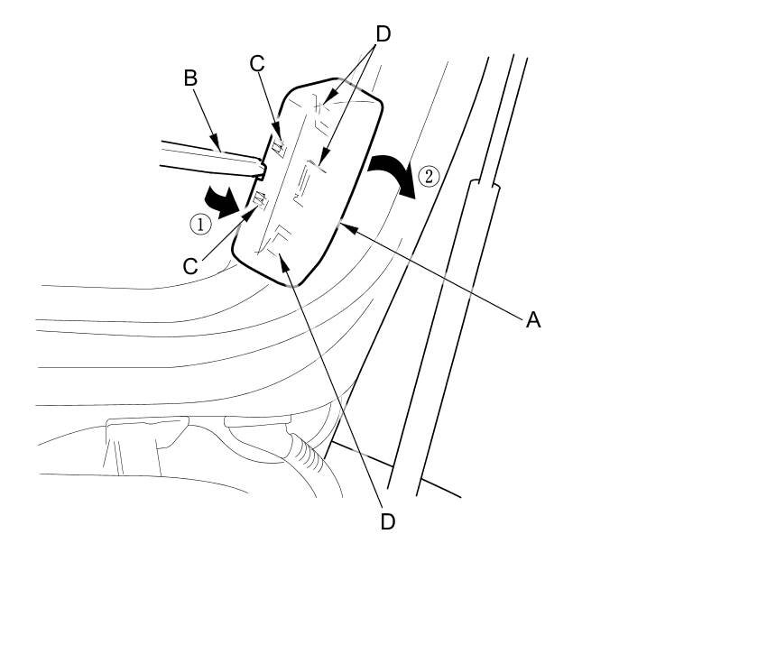 2. Use the trim tool (B) to gently pry the cover up partially to detach the hooks (C, D), then rotate the cover, and detach the hook (E).