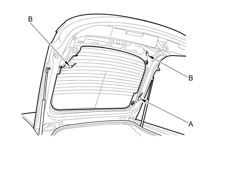 13. Attach a new upper seal (A) with adhesive tape along the upper edge of the upper rear window (B):