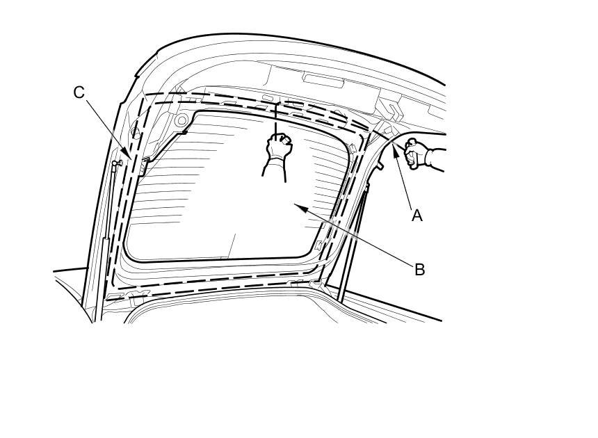 8. With a helper on the outside, pull the piano wire (A) back and forth in a sawing motion. Hold the piano wire as close to the upper rear window (B) as possible to prevent damage to the hatch, and carefully cut through the adhesive (C) around the entire upper rear window.