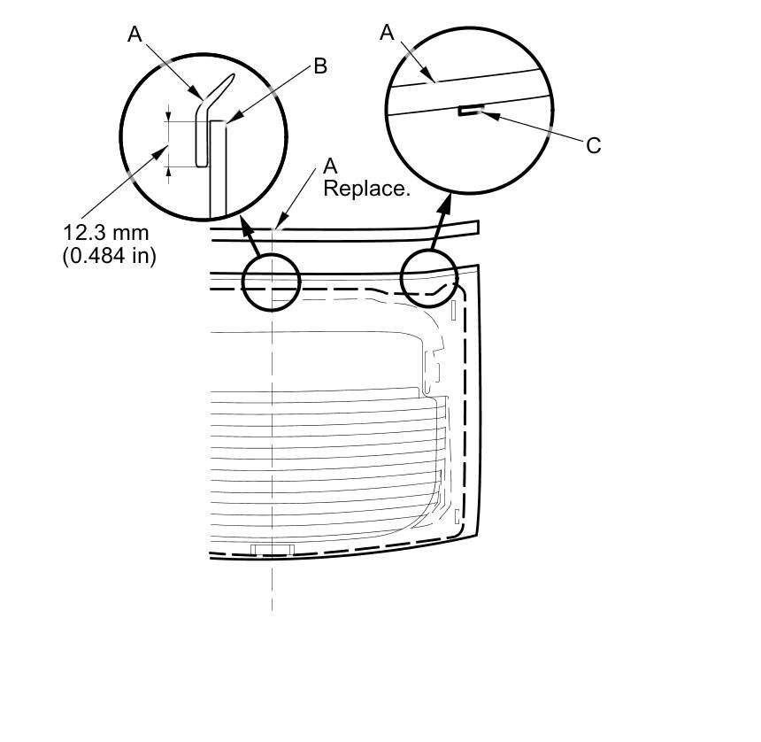 21. Pack adhesive into the cartridge without air pockets to ensure continuous delivery. Put the cartridge in a caulking gun, and run a continuous bead of adhesive (A) to the upper rear window (B) along the edge of the rubber dams (C) as shown:
