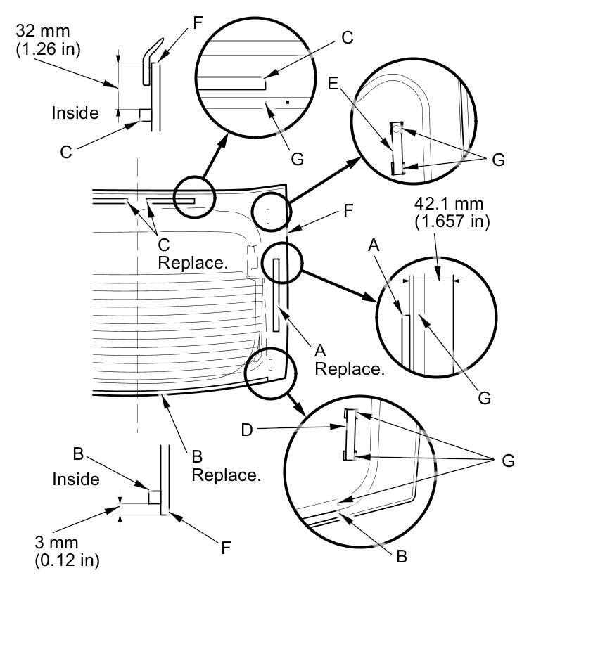 14. Attach a new rubber dam A, B, C and the fasteners (D, E) with the adhesive tape to the inside face of the upper rear window (F) as shown: