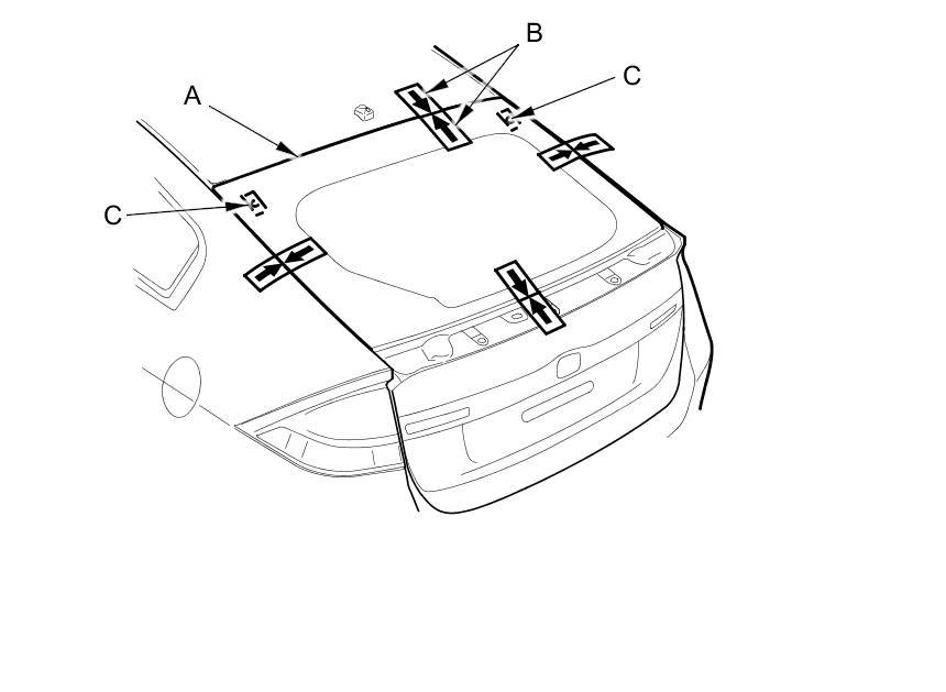 16. Set the upper rear window (A) in the opening, and center it. Make alignment marks (B) across the upper rear window and the body with a grease pencil at the four points shown. Make sure the fasteners (C) contact with the edge of body hole. Be careful not to touch the upper rear window where the adhesive will be applied.