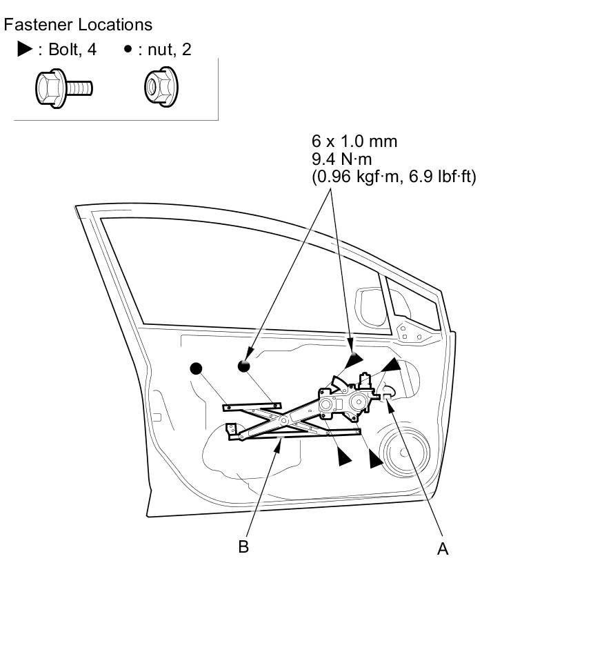 4. Remove the bolts and the nuts, then remove the regulator through the hole in the door.