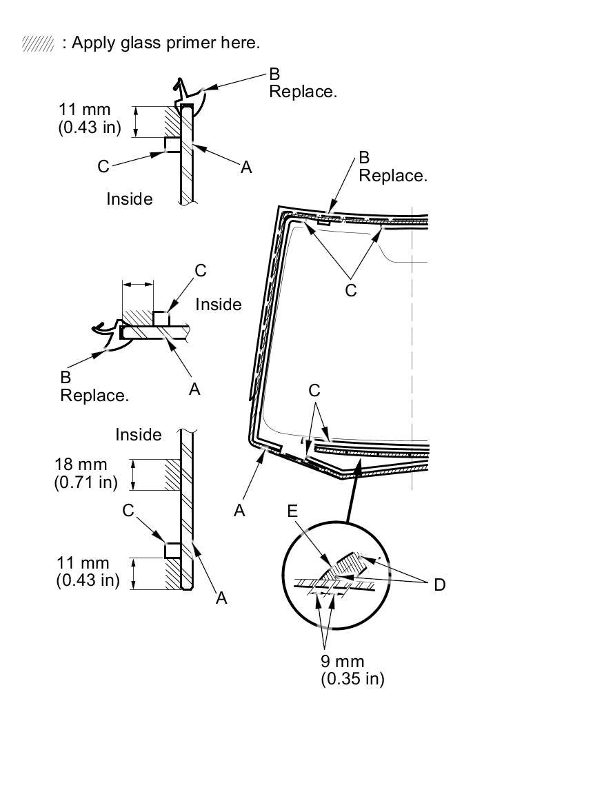 - With the printed dots (D) on the windshield as a guide, apply glass primer to the bottom (E) of the windshield.
