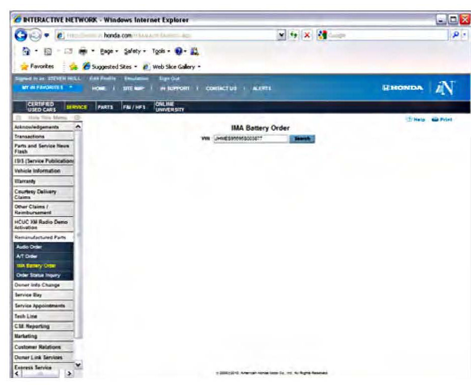 2. From the iN main menu, select SERVICE, select Remanufactured Parts, then select IMA Battery Order.