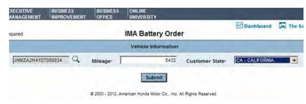 5. Enter the mileage and the customer's state, and select Submit to view the IMA Battery Order form.