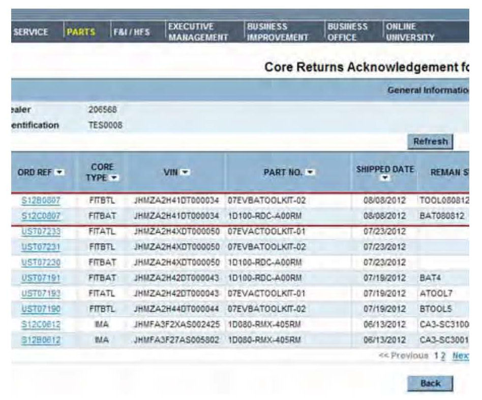 ^ From the Core Returns Acknowledgement screen, select the order reference number for the equipment kit.