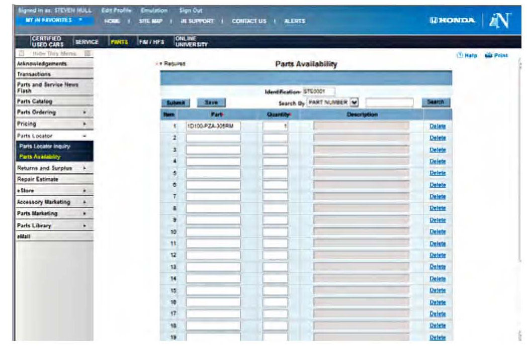 Answer: Go to the iN home page and select PARTS, then Parts Locator, then Parts Availability. Enter the part number found at the bottom of the IMA Battery Order form in line 1, enter the quantity desired, then select Submit.