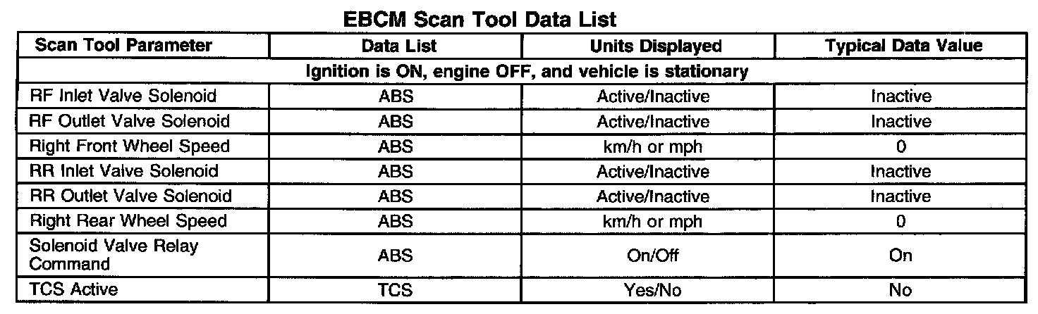 The EBCM Scan Tool Data Lists contain all the antilock brake system related parameters that are available on the scan tool. The parameters on the list are arranged in alphabetical order. The "Column" data list shows the location of the parameter on the scan tool displayed menu selections.